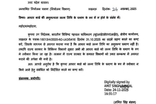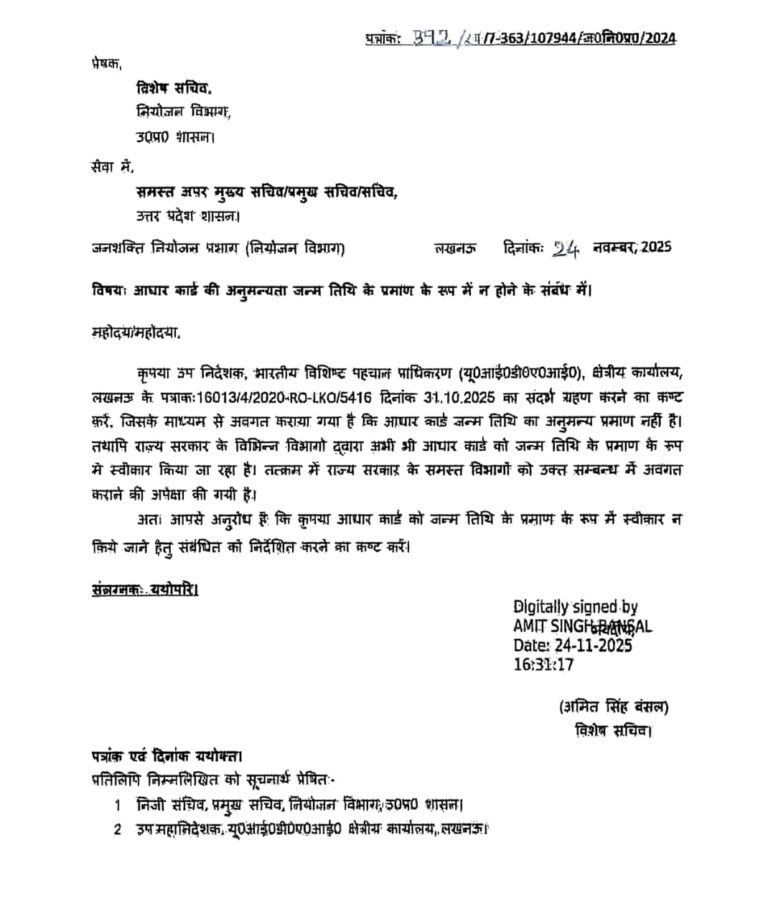 नित्य समाचार👁👁 * यूपी में बड़ा फैसला* ✍️✍️✍️✍️ अब आधार कार्ड से नहीं चलेगा काम! उत्तर प्रदेश सरकार ने आधार कार्ड को जन्म प्रमाण पत्र या Date of Birth के सबूत के रूप में मान्य करने पर रोक लगा दी है। 📝 प्लानिंग डिपार्टमेंट ने सभी विभागों को आदेश जारी किया स्पेशल सेक्रेटरी अमित…