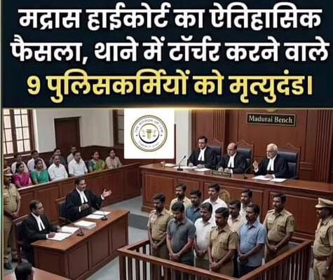 नित्य समाचार👁👁 एक ऐतिहासिक फैसले में प्रथम अतिरिक्त जिला एवं सत्र न्यायाधीश, मदुरै ने सत्तनकुलम कस्टोडियल डेथ केस में सभी 9 पुलिसकर्मियों को मौत की सजा सुनाई है। इंस्पेक्टर एस श्रीधर, सब-इंस्पेक्टर पी रघु गणेश और के बालकृष्णन, हेड कॉन्स्टेबल एस मुरुगन और ए सामिदुरई, तथा कॉन्स्टेबल एम मुथुराजा, एस वेल मुथु, एस चेल्लादुरई…