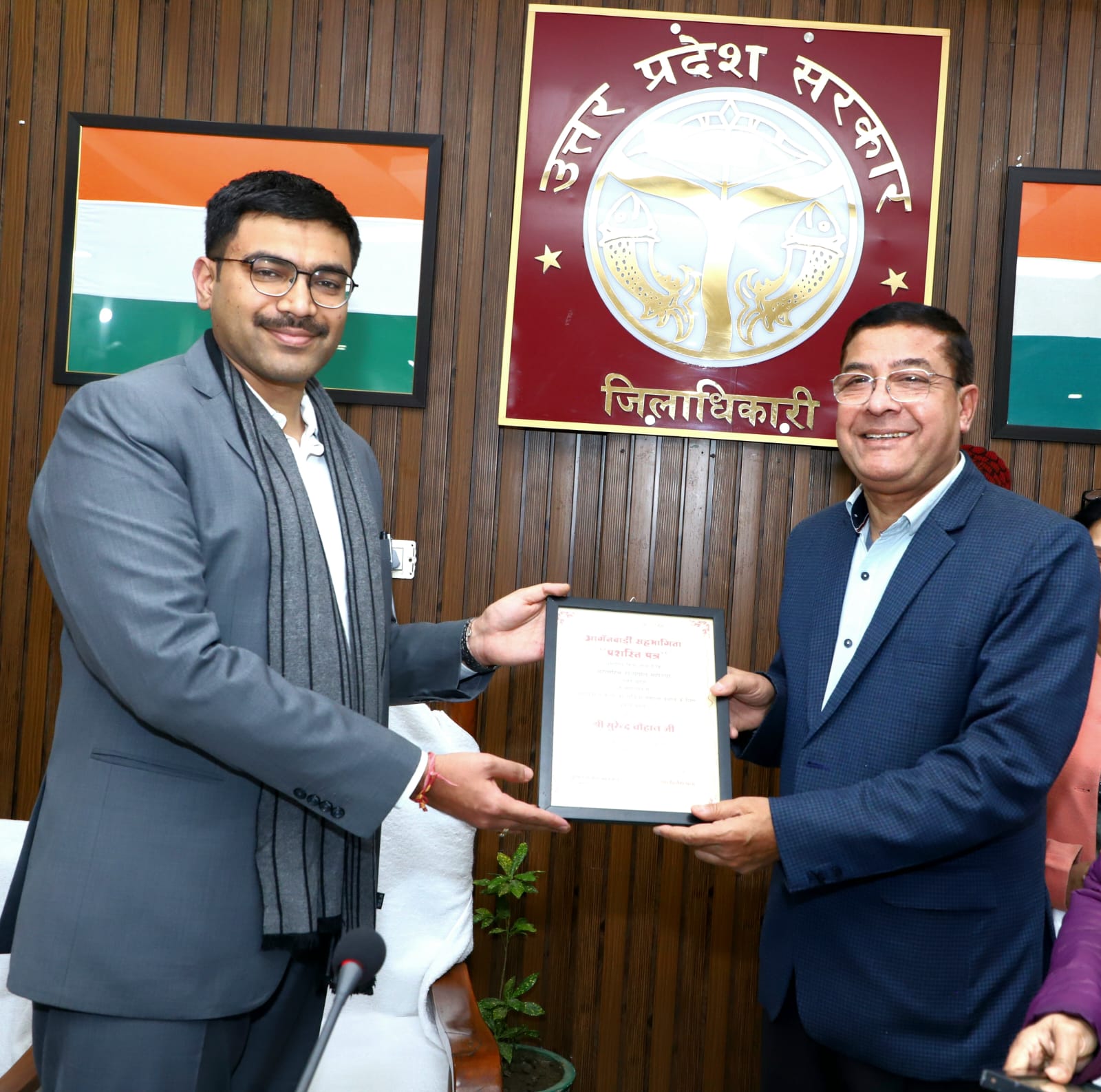 स्थानीय कलेक्ट्रेट स्थित नवीन सभागार में जनपद के सभी स्कूल संचालकों व प्रधानाचार्यों की मौजूदगी में जिलाधिकारी मनीष बंसल ने प्रशस्तिपत्र देकर प्रोग्रेसिव स्कूल्स सोसाइटी के संयोजक व वरिष्ठ पत्रकार सुरेन्द्र चौहान को आंगनबाड़ी केंद्रों को किट्स उपलब्ध कराने समेत जिला प्रशासन के विभिन्न जनकल्याणकारी कार्यक्रम मे विशेष योगदान के लिए सम्मानित किया। जिलाधिकारी मनीष बंसल ने उनके योगदान की सराहना करते हुए उन्हे आगामी 24 जनवरी को आयोजित होने वाले उत्तर प्रदेश दिवस व 25 जनवरी को राष्ट्रीय मतदाता दिवस कार्यक्रम में महत्वपूर्ण जिम्मेदारी सौंपी। गौरतलब है वरिष्ठ पत्रकार सुरेन्द्र चौहान प्रोग्रेसिव स्कूल्स सोसाइटी, डिस्ट्रिक्ट प्रेस क्लब,सहारनपुर सिटीजन फाउंडेशन सहित दर्जनों सामाजिक, शैक्षणिक, सांस्कृतिक व स्वयंसेवी संस्थाओं से जुड़े हुए है तथा गत वर्ष तत्कालीन जिलाधिकारी दिनेश चंद्र द्वारा राष्ट्रीय मतदाता दिवस पर आयोजित सात किमी लंबी मतदाता जागरूकता पेंटिंग प्रतियोगिता मे सुरेंद्र चौहान को उल्लेखनीय योगदान के लिए विशेष पगड़ी पहनाकर सम्मानित किया गया था तथा सहारनपुर आगमन पर उत्तर प्रदेश की राज्यपाल महामहिम आनंदीबेन पटेल द्वारा भी सम्मानित किया गया था।