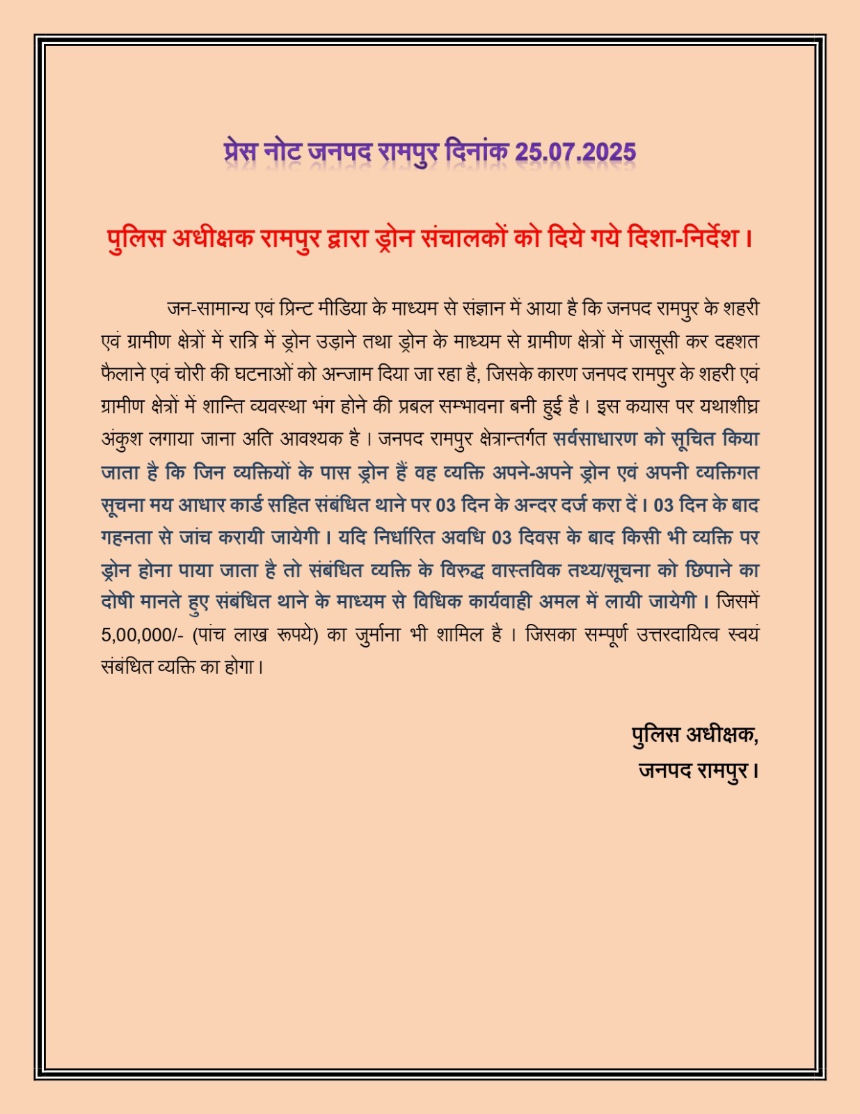 रामपुर के जन-सामान्य एवं प्रिन्ट मीडिया के माध्यम से संज्ञान में आया है कि जनपद रामपुर के शहरी एवं ग्रामीण क्षेत्रों में रात्रि में ड्रोन उड़ाने तथा ड्रोन के माध्यम से ग्रामीण क्षेत्रों में जासूसी कर दहशत फैलाने एवं चोरी की घटनाओं को अन्जाम दिया जा रहा है, जिसके कारण जनपद रामपुर के शहरी एवं ग्रामीण क्षेत्रों में शान्ति व्यवस्था भंग होने की प्रबल सम्भावना बनी हुई है । इस कयास पर यथाशीघ्र अंकुश लगाया जाना अति आवश्यक है । जनपद रामपुर क्षेत्रान्तर्गत *सर्वसाधारण को सूचित किया जाता है कि जिन व्यक्तियों के पास ड्रोन हैं वह व्यक्ति अपने-अपने ड्रोन एवं अपनी व्यक्तिगत सूचना मय आधार कार्ड सहित संबंधित थाने पर 03 दिन के अन्दर दर्ज करा दें । 03 दिन के बाद गहनता से जांच करायी जायेगी । यदि निर्धारित अवधि 03 दिवस के बाद किसी भी व्यक्ति पर ड्रोन होना पाया जाता है तो संबंधित व्यक्ति के विरुद्ध वास्तविक तथ्य/सूचना को छिपाने का दोषी मानते हुए संबंधित थाने के माध्यम से विधिक कार्यवाही अमल में लायी जायेगी ।* जिसमें 5,00,000/- (पांच लाख रूपये) का जुर्माना भी शामिल है । जिसका सम्पूर्ण उत्तरदायित्व स्वयं संबंधित व्यक्ति का होगा ।