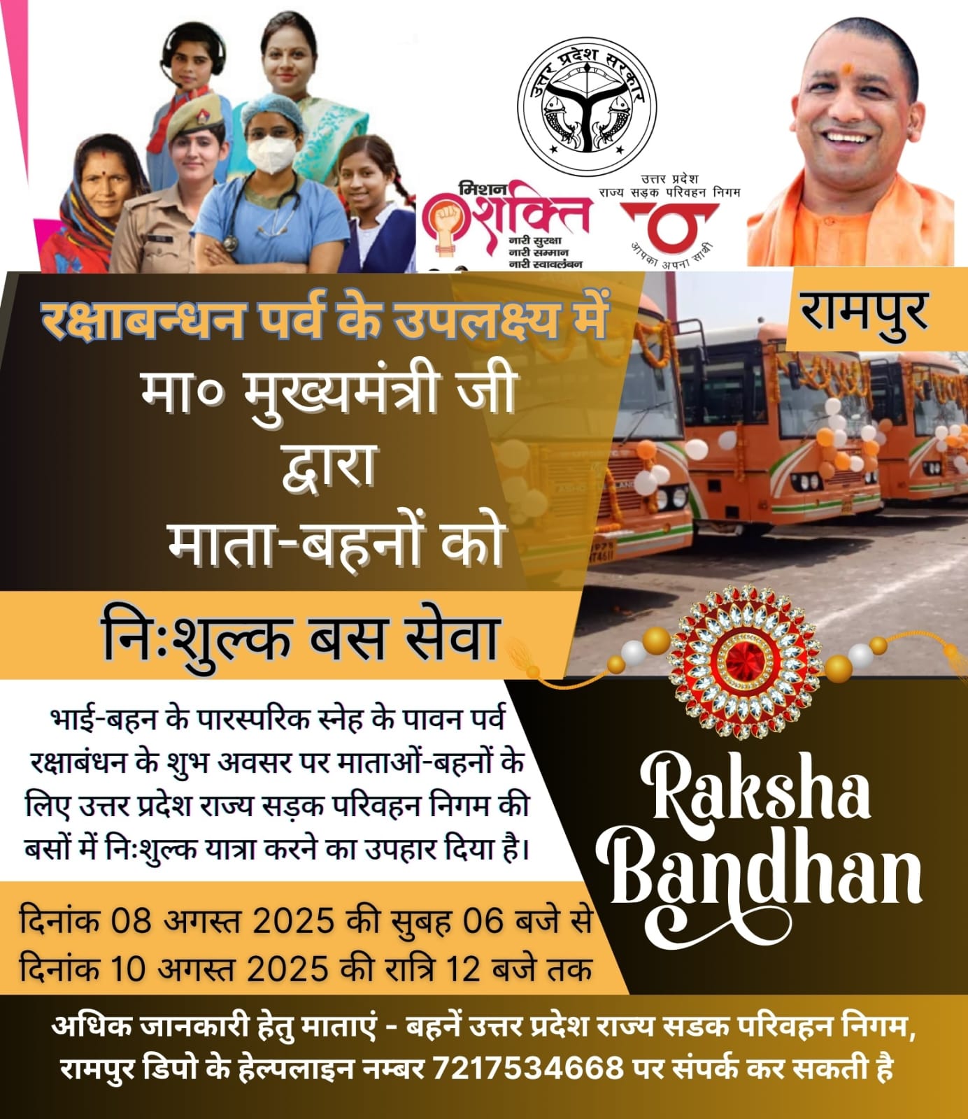 👉अधिक जानकारी हेतु माताएं – बहनें उत्तर प्रदेश राज्य सडक परिवहन निगम, रामपुर डिपो के हेल्पलाइन नम्बर 7217534668 पर संपर्क कर सकती है