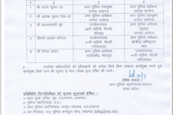 *11 अपर पुलिस अधीक्षकों का हुआ तबादला*   कुमार रणविजय सिंह ASP मुरादाबाद नगर बने,अखिलेश भदौरिया ASP ग्रामीण फिरोजाबाद बने। शिवराम यादव ASP पीटीएस मेरठ बनाए गए,अलका धर्मराज ASP क्षेत्रीय अभिसूचना मेरठ बनीं, श्रीपाल यादव ASP अधिसूचना मुख्यालय लखनऊ,शशि शेखर सिंह ASP पीटीएस लखनऊ बने,सुशील कुमार सिंह प्रथम ASP संतकबीरनगर बने। अजय कुमार तृतीय ASP…